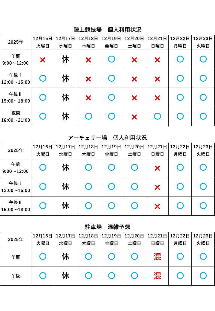 陸上競技場・アーチェリー場個人利用案内・駐車場混雑予想