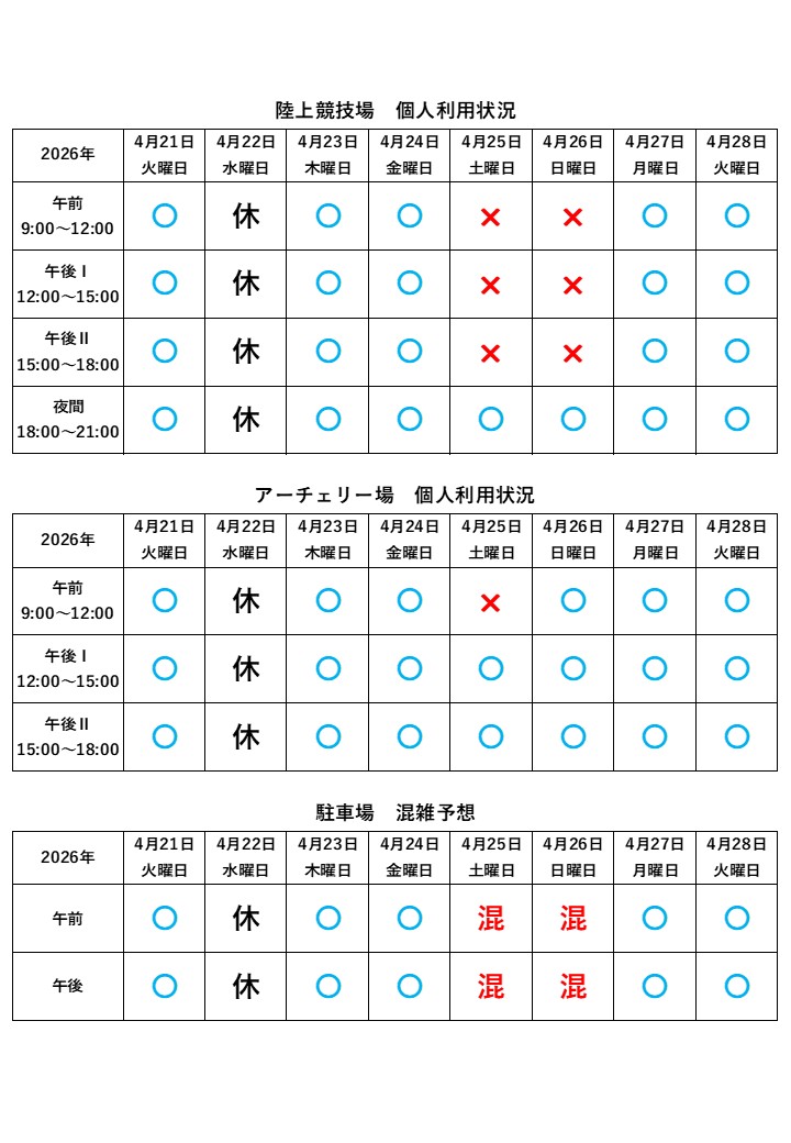 陸上競技場・アーチェリー場個人利用案内・駐車場混雑予想