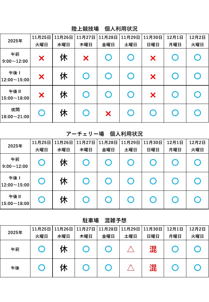 陸上競技場・アーチェリー場個人利用案内・駐車場混雑予想